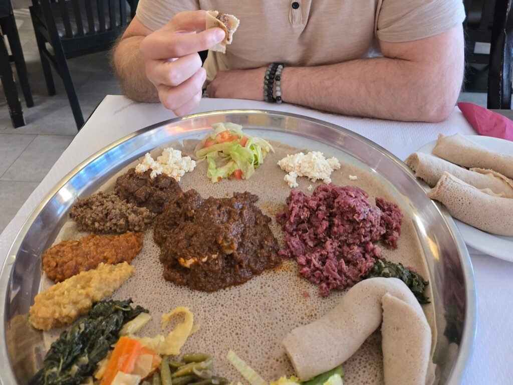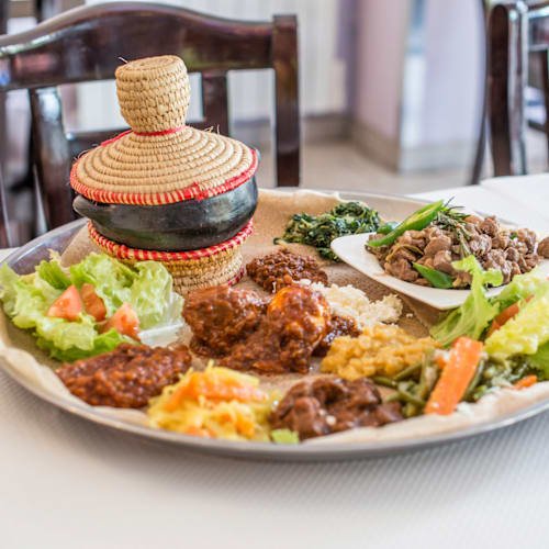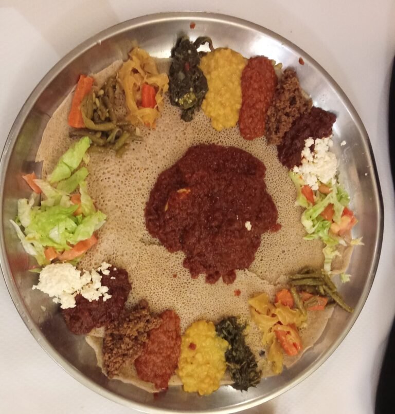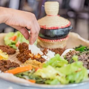 On y déguste l’incontournable injera (galette traditionnelle) accompagnée de plats parfumés : lentilles, agneau au beurre épicé, ou assiettes végétariennes généreuses 🌶️🥬