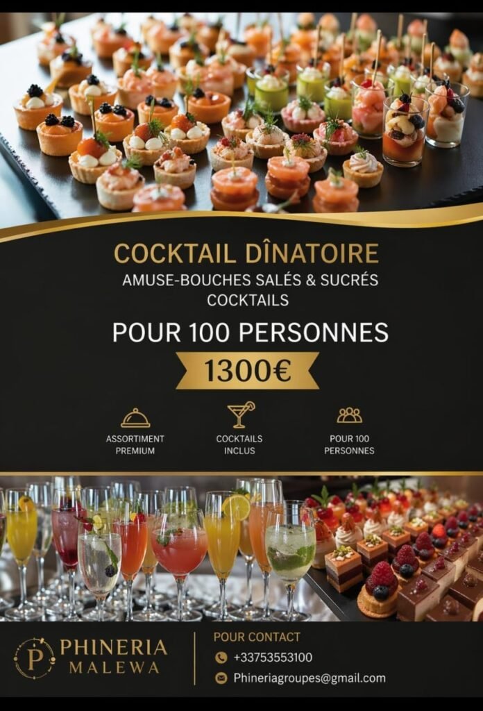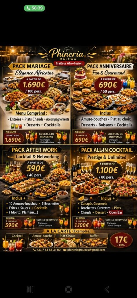Phineria Malewa est un service de traiteur spécialisé dans la cuisine africaine, amuse-bouches et cocktails pour vos événements avec une expertise particulière dans les saveurs authentiques du Congo. Ces professionnels apportent une touche chaleureuse, élégante et originale à vos événements grâce à des plats traditionnels préparés avec passion et des ingrédients de qualité. Ils accompagnent leurs clients pour tous types d’événements, notamment :